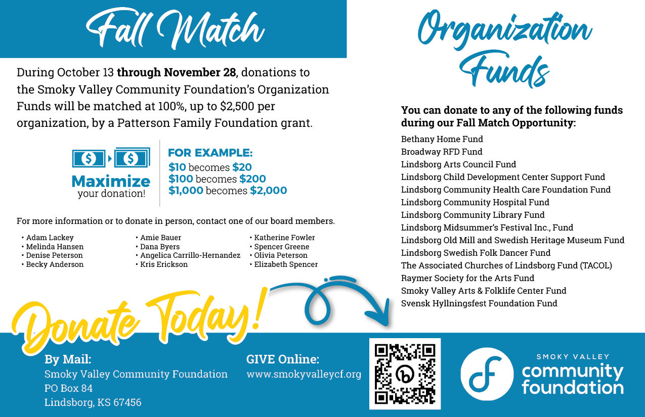 From October 13-November 28th, donations to Foundation organization funds will be matched at 100%, up to $2,500 per organization by the Patterson Family Foundation grant.